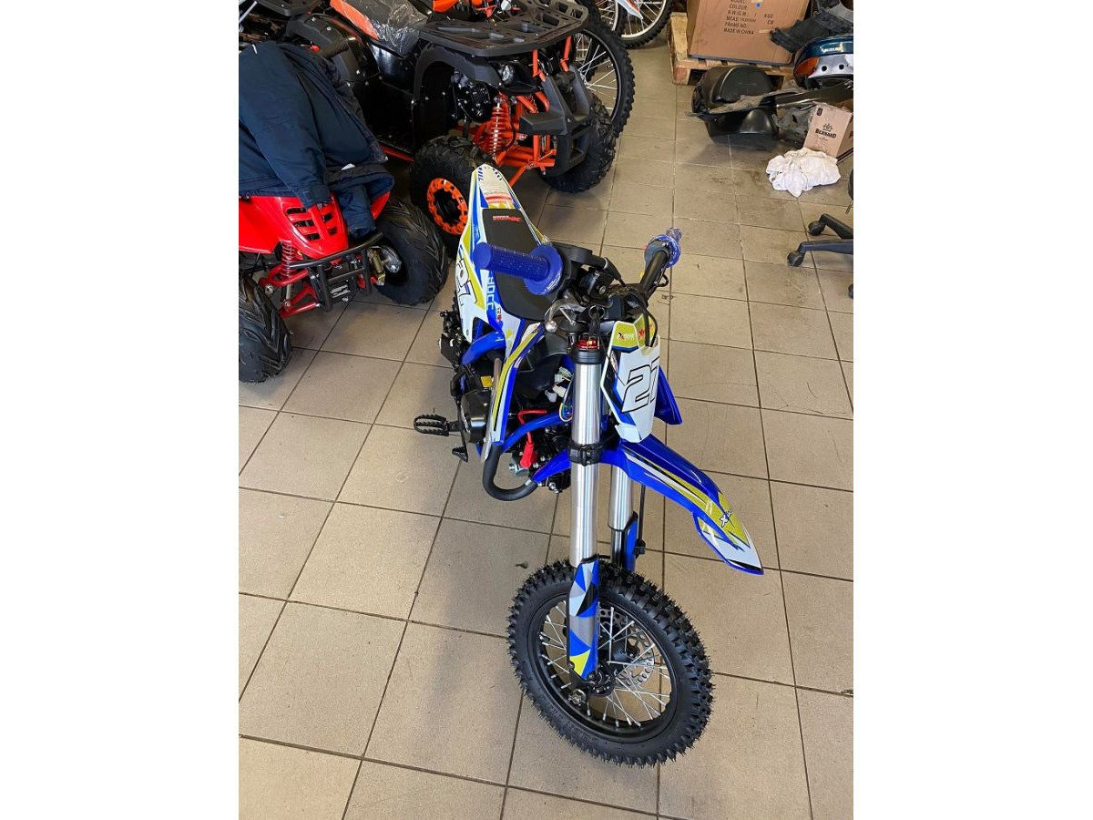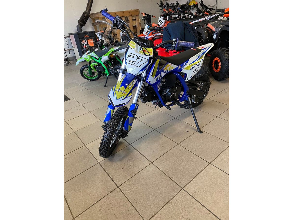 Motocykl XMOTOS - XB27 Automatic 90cc 4t 12/10 má výkon 4kW, poloaumatickou převodovku,4R sportovní výfuk, přední i zadní hydraulické kotoučové brzdy (zadní-nožní), masivní přední tlumiče, zadní odpružení s nastavitelnou tuhostí, elektrický startér, přední kolo 12 palců, zadní kolo 10 palců.